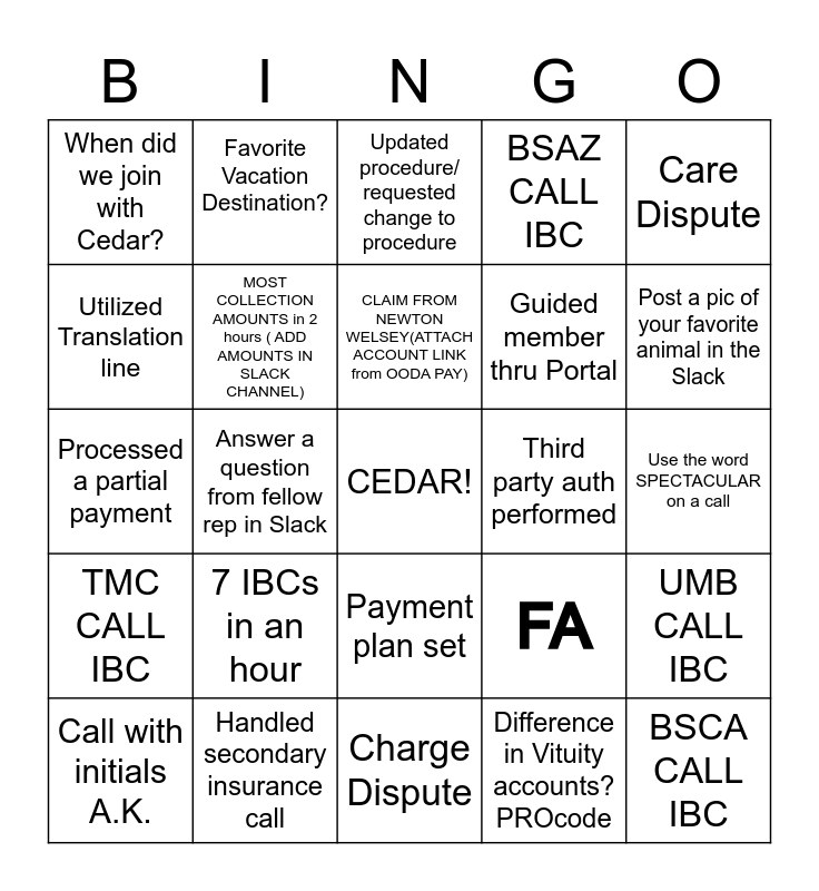 This bingo card has a free space and 24 words: Call with initials A.K., 7 IBCs in an hour, CLAIM FROM NEWTON WELSEY(ATTACH ACCOUNT LINK from OODA PAY), Difference in Vituity accounts? PROcode, Care Dispute, When did we join with Cedar?, Favorite Vacation Destination?, Updated procedure/ requested change to procedure, Third party auth performed, Use the word SPECTACULAR on a call, Processed a partial payment, MOST COLLECTION AMOUNTS in 2 hours ( ADD AMOUNTS IN SLACK CHANNEL), FA, UMB CALL IBC, Utilized Translation line, Handled secondary insurance call, Charge Dispute, BSAZ CALL IBC, Post a pic of your favorite animal in the Slack, TMC CALL IBC, Answer a question from fellow rep in Slack, Payment plan set, Guided member thru Portal and BSCA CALL IBC.
