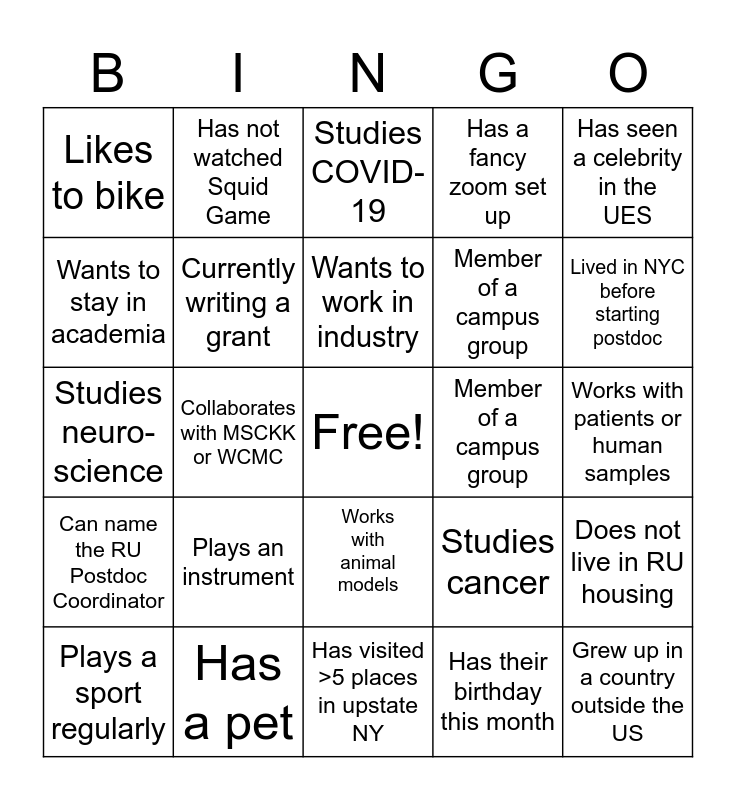 This bingo card has a free space and 24 words: Plays an instrument, Has a pet, Wants to work in industry, Plays a sport regularly, Has seen a celebrity in the UES, Likes to bike, Wants to stay in academia, Has not watched Squid Game, Member of a campus group, Works with animal models, Member of a campus group, Studies neuro-science, Studies cancer, Does not live in RU housing, Currently writing a grant, Has their birthday this month, Works with patients or human samples, Studies COVID-19, Lived in NYC before starting postdoc, Collaborates with MSCKK or WCMC, Grew up in a country outside the US, Can name the RU Postdoc Coordinator, Has a fancy zoom set up and Has visited >5 places in upstate NY.