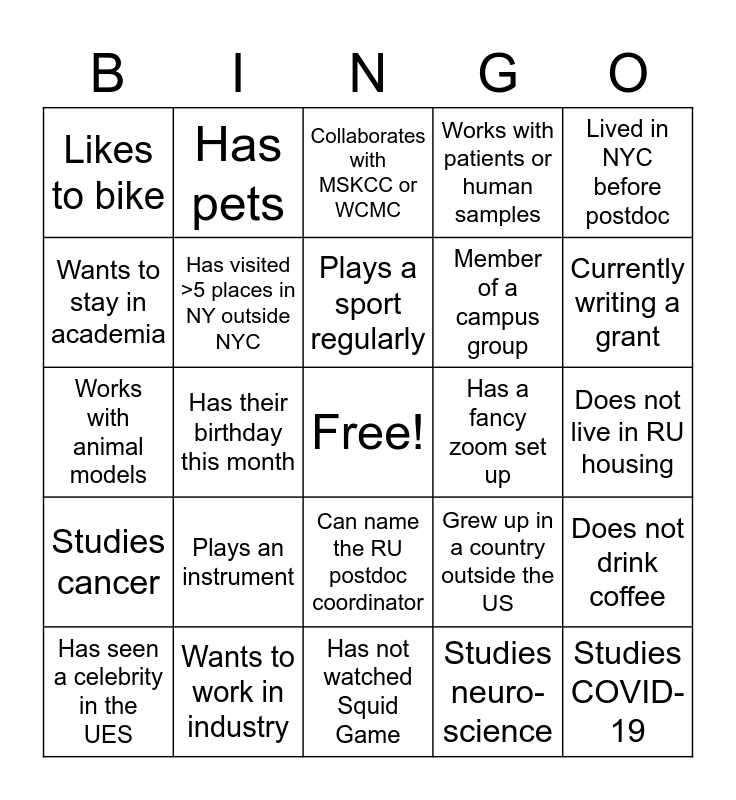 This bingo card has a free space and 24 words: Plays an instrument, Wants to work in industry, Plays a sport regularly, Has seen a celebrity in the UES, Lived in NYC before postdoc, Likes to bike, Wants to stay in academia, Has pets, Has a fancy zoom set up, Can name the RU postdoc coordinator, Member of a campus group, Works with animal models, Grew up in a country outside the US, Does not drink coffee, Has visited >5 places in NY outside NYC, Studies neuro-science, Does not live in RU housing, Collaborates with MSKCC or WCMC, Currently writing a grant, Has their birthday this month, Studies COVID-19, Studies cancer, Works with patients or human samples and Has not watched Squid Game.