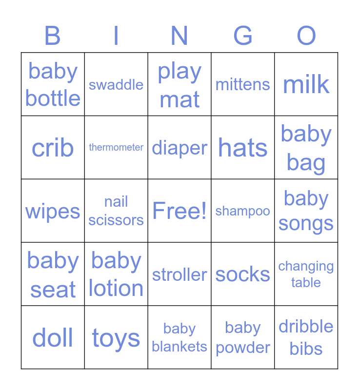 This bingo card has a free space and 24 words: baby lotion, toys, diaper, doll, milk, baby bottle, crib, swaddle, shampoo, stroller, hats, wipes, socks, changing table, thermometer, baby powder, baby songs, play mat, baby bag, nail scissors, dribble bibs, baby seat, mittens and baby blankets.