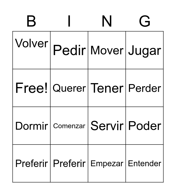 This bingo card has 16 words: Preferir, Poder, Mover, Volver, Dormir, Pedir, Servir, Empezar, Free!, Querer, Preferir, Jugar, Comenzar, Perder, Tener and Entender.