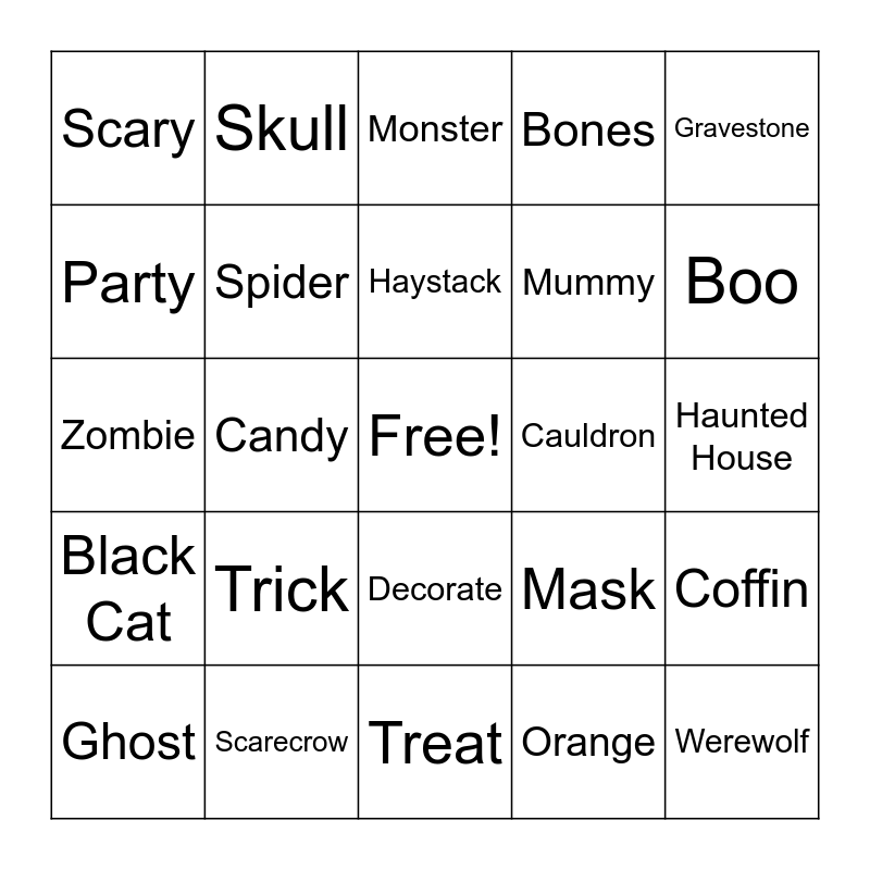 This bingo card has a free space and 29 words: Ghost, Costume, Candy, Pumpkin, Scary, Monster, Spider, Trick, Cauldron, Scarecrow, Haunted House, Werewolf, Treat, Orange, Boo, Vampire, Decorate, Black Cat, Gravestone, Zombie, Mask, October, Mummy, Party, Bones, Skull, Coffin, Haystack and Creepy.