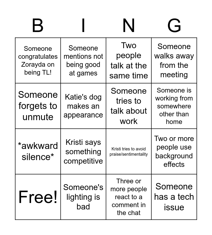 This bingo card has 16 words: Someone's lighting is bad, Two or more people use background effects, Two people talk at the same time, Someone congratulates Zorayda on being TL!, *awkward silence*, Someone mentions not being good at games, Kristi tries to avoid praise/sentimentality, Three or more people react to a comment in the chat, Someone forgets to unmute, Katie's dog makes an appearance, Free!, Someone walks away from the meeting, Kristi says something competitive, Someone is working from somewhere other than home, Someone tries to talk about work and Someone has a tech issue.
