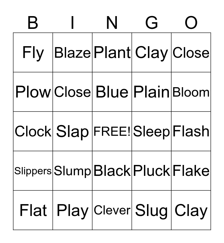 This bingo card has a free space and 24 words: Slump, Play, Blue, Flat, Close, Fly, Plow, Blaze, Sleep, Black, Plain, Clock, Pluck, Flake, Close, Slug, Flash, Plant, Bloom, Slap, Clay, Slippers, Clay and Clever.