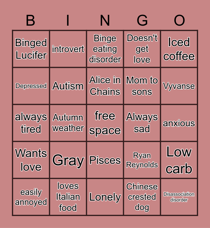 This bingo card has a free space and 24 words: Gray, loves Italian food, Alice in Chains, easily annoyed, Iced coffee, Binged Lucifer, Depressed, introvert, Always sad, Pisces, Mom to sons, always tired, Ryan Reynolds, Low carb, Autism, Chinese crested dog, anxious, Binge eating disorder, Vyvanse, Autumn weather, Disassociation disorder, Wants love, Doesn't get love and Lonely.