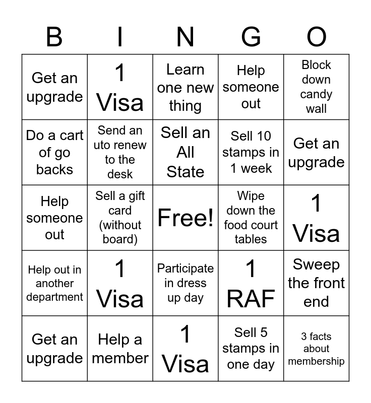 This bingo card has a free space and 24 words: 1 Visa, Help a member, Sell an All State, Get an upgrade, Block down candy wall, Get an upgrade, Do a cart of go backs, 1 Visa, Wipe down the food court tables, Participate in dress up day, Sell 10 stamps in 1 week, Help someone out, 1 RAF, Sweep the front end, Send an uto renew to the desk, Sell 5 stamps in one day, 1 Visa, Learn one new thing, Get an upgrade, Sell a gift card (without board), 3 facts about membership, Help out in another department, Help someone out and 1 Visa.