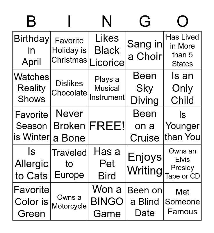 This bingo card has a free space and 24 words: Traveled to Europe, Owns a Motorcycle, Plays a Musical Instrument, Favorite Color is Green, Has Lived in More than 5 States, Birthday in April, Watches Reality Shows, Favorite Holiday is Christmas, Been on a Cruise, Has a Pet Bird, Been Sky Diving, Favorite Season is Winter, Enjoys Writing, Owns an Elvis Presley Tape or CD, Dislikes Chocolate, Been on a Blind Date, Is Younger than You, Likes Black Licorice, Is an Only Child, Never Broken a Bone, Met Someone Famous, Is Allergic to Cats, Sang in a Choir and Won a BINGO Game.