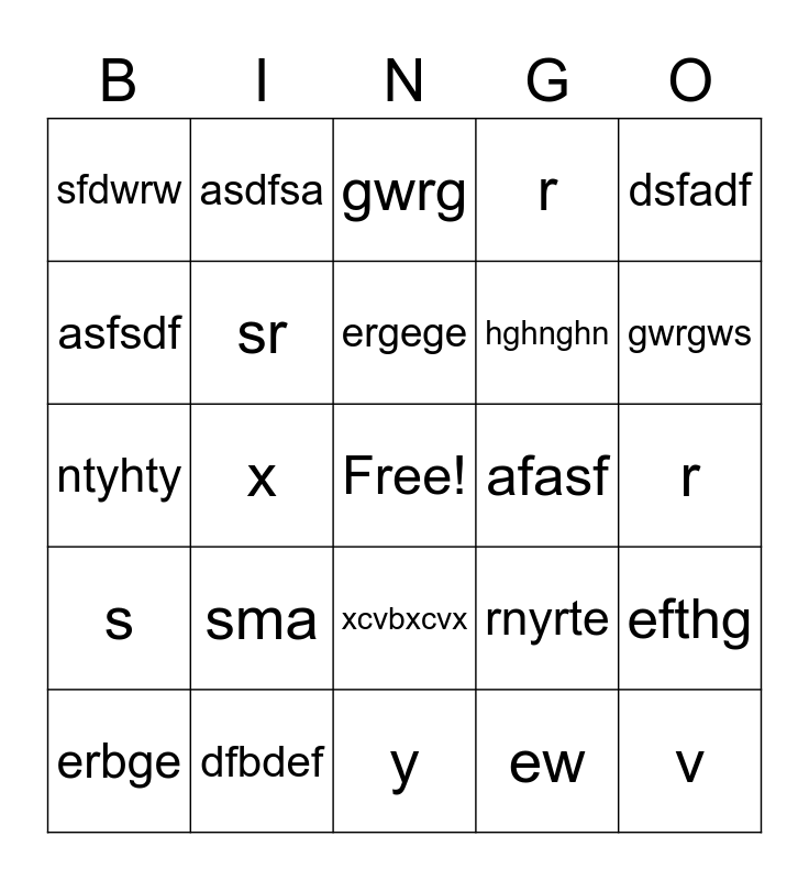 This bingo card has a free space and 24 words: sma, dfbdef, ergege, erbge, dsfadf, sfdwrw, asfsdf, asdfsa, afasf, xcvbxcvx, hghnghn, ntyhty, rnyrte, efthg, sr, ew, r, gwrg, gwrgws, x, v, s, r and y.