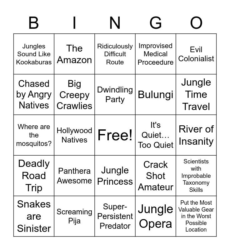 This bingo card has a free space and 36 words: Jungle Drums, Adventurer Outfit, All the Jungle Ladies Wear Tank Tops, Big Creepy Crawlies, Crack Shot Amateur, Deadly Road Trip, Dwindling Party, Everything Here Is Trying To Kill You, Evil Colonialist, Evil Poacher, Hollywood Natives, Improvised Medical Proceedure, Inevitable Waterfall, It's Quiet…Too Quiet, Jungle Time Travel, Jungles Sound Like Kookaburas, Native Guide, Panthera Awesome, Put the Most Valuable Gear in the Worst Possible Location, Ridiculously Difficult Route, River of Insanity, Scientists with Improbable Taxonomy Skills, Screaming Pija, Snakes are Sinister, Super-Persistent Predator, The Amazon, Where are the mosquitos?, Exit - Pursued by a Bear, Bulungi, Chased by Angry Natives, Holiday in Cambodia, Hula & Luaus, Jungle Opera, Jungle Princess, Jungle Warfare and Killer Gorilla.