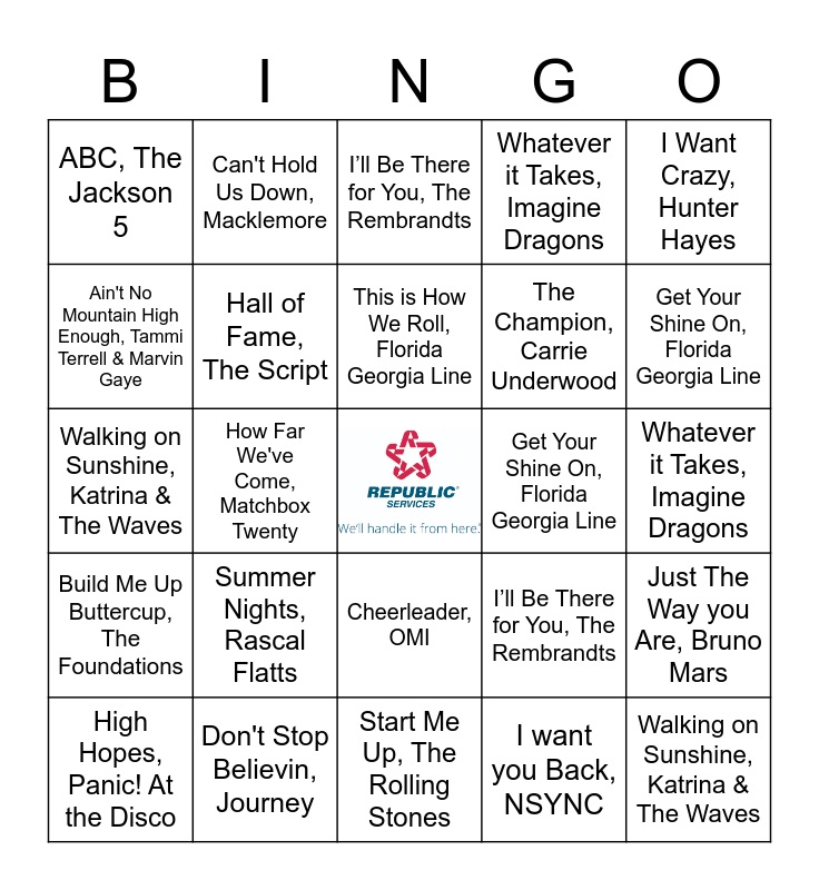 ⚠ This card has duplicate items: I Wanna Dance with Somebody, Whitney Houston (2), Don't Stop Believin, Journey (2), It's Still Rock and Roll to Me, Billy Joel (2), Build Me Up Buttercup, The Foundations (2), Just The Way you Are, Bruno Mars (2), What Makes You Beautiful, One Direction (2), Hall of Fame, The Script (2), Stronger, Kelly Clarkson (2), The Champion, Carrie Underwood (2), Believer, Imagine Dragons (2), Whatever it Takes, Imagine Dragons (2), Can't Hold Us Down, Macklemore (2), Ain't No Mountain High Enough, Tammi Terrell & Marvin Gaye (2), Happy, Pharrel Williams (2), How Far We've Come, Matchbox Twenty (2), ABC, The Jackson 5 (2), Walking on Sunshine, Katrina & The Waves (2), I Want Crazy, Hunter Hayes (2), Summer Nights, Rascal Flatts (2), This is How We Roll, Florida Georgia Line (2), Get Your Shine On, Florida Georgia Line (2), I’ll Be There for You, The Rembrandts (2), High Hopes, Panic! At the Disco (2), I want you Back, NSYNC (2)