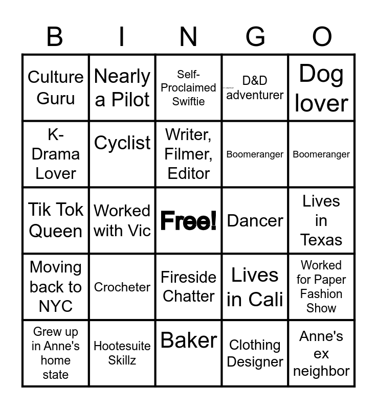 This bingo card has 1 images, a free space and 24 words: Crocheter, Hootesuite Skillz, Writer, Filmer, Editor, Grew up in Anne's home state, Dog lover, Culture Guru, K-Drama Lover, Nearly a Pilot, Dancer, Fireside Chatter, Boomeranger, Tik Tok Queen, Lives in Cali, Worked for Paper Fashion Show, Cyclist, Clothing Designer, Lives in Texas, Self-Proclaimed Swiftie, Boomeranger, Worked with Vic, Anne's ex neighbor, Moving back to NYC, D&D adventurer and Baker.