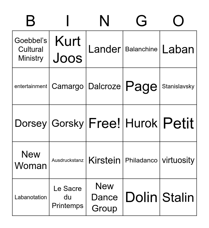 This bingo card has a free space and 24 words: Ausdruckstanz, Le Sacre du Printemps, Dalcroze, Labanotation, Laban, Goebbel’s Cultural Ministry, entertainment, Kurt Joos, Hurok, Kirstein, Page, Dorsey, Philadanco, virtuosity, Camargo, Dolin, Petit, Lander, Stanislavsky, Gorsky, Stalin, New Woman, Balanchine and New Dance Group.