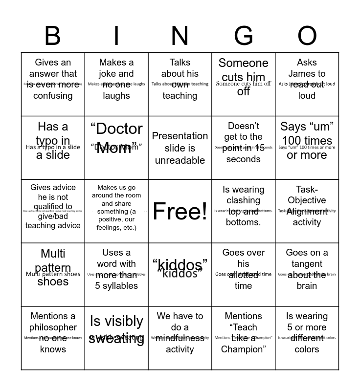 This bingo card has 24 images, a free space and 25 words: Uses a word with more than 5 syllables, We have to do a mindfulness activity, Presentation slide is unreadable, Mentions a philosopher no one knows, Asks James to read out loud, Gives an answer that is even more confusing, Has a typo in a slide, Makes a joke and no one laughs, Is wearing clashing top and bottoms., “kiddos”, Doesn’t get to the point in 15 seconds, Gives advice he is not qualified to give/bad teaching advice, Goes over his allotted time, Goes on a tangent about the brain, “Doctor Mom”, Uses a word we don’t know/have to look up, Task-Objective Alignment activity, Talks about his own teaching, Says “um” 100 times or more, Makes us go around the room and share something (a positive, our feelings, etc.), Is wearing 5 or more different colors, Is visibly sweating, Multi pattern shoes, Someone cuts him off and Mentions “Teach Like a Champion”.