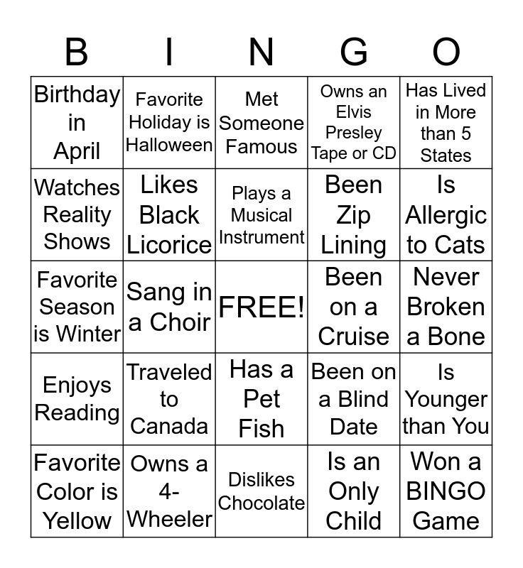 This bingo card has a free space and 24 words: Traveled to Canada, Owns a 4-Wheeler, Plays a Musical Instrument, Favorite Color is Yellow, Has Lived in More than 5 States, Birthday in April, Watches Reality Shows, Favorite Holiday is Halloween, Been on a Cruise, Has a Pet Fish, Been Zip Lining, Favorite Season is Winter, Been on a Blind Date, Is Younger than You, Likes Black Licorice, Is an Only Child, Never Broken a Bone, Met Someone Famous, Is Allergic to Cats, Sang in a Choir, Won a BINGO Game, Enjoys Reading, Owns an Elvis Presley Tape or CD and Dislikes Chocolate.