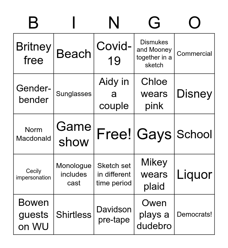 This bingo card has a free space and 24 words: Monologue includes cast, Shirtless, Aidy in a couple, Bowen guests on WU, Commercial, Britney free, Gender-bender, Beach, Gays, Sketch set in different time period, Chloe wears pink, Norm Macdonald, Mikey wears plaid, Liquor, Sunglasses, Owen plays a dudebro, School, Covid-19, Disney, Game show, Democrats!, Cecily impersonation, Dismukes and Mooney together in a sketch and Davidson pre-tape.