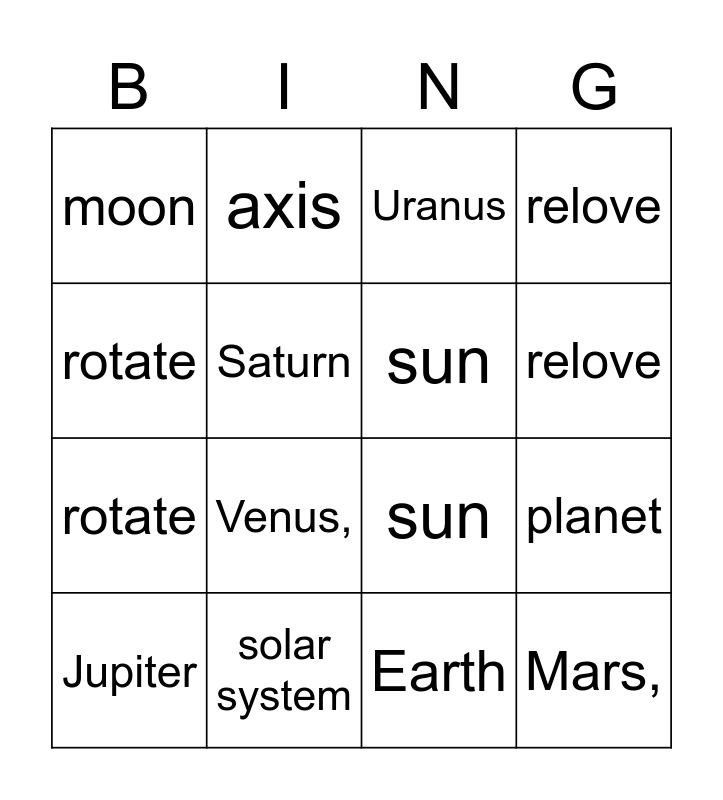 This bingo card has 32 words: Mercury, Venus, Earth, Mars, Jupiter, Saturn, Uranus, Neptune, rotate, axis, sun, relove, moon, solar system, universe, planet, Mercury,, Venus,, Earth,, Mars,, Jupiter,, Saturn,, Uranus,, Neptune, rotate, axis, sun, relove, moon, solar system, universe and planet.