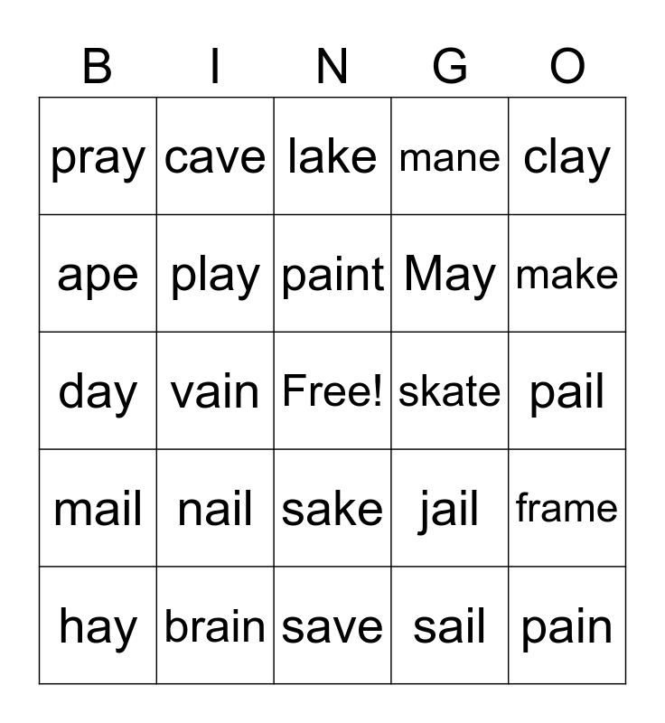 This bingo card has a free space and 24 words: nail, brain, paint, hay, clay, pray, ape, cave, skate, sake, May, day, jail, frame, play, sail, pail, lake, make, vain, pain, mail, mane and save.