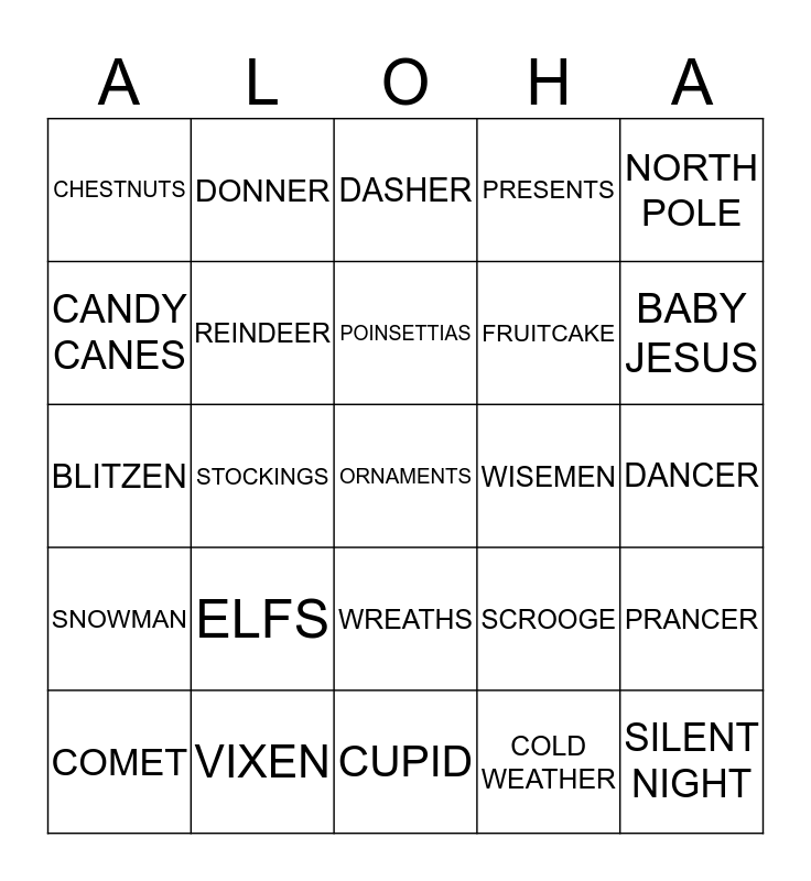 This bingo card has a free space and 36 words: NAUGHTY OR NICE LIST, SANTA CLAUS, SLEIGH, REINDEER, SCROOGE, SNOWMAN, POINSETTIAS, MISTLETOE, NORTH POLE, MRS.CLAUS, STOCKINGS, PRESENTS, LUMPS OF COAL, WISEMEN, BABY JESUS, CHESTNUTS, DECORATIONS, ELFS, SILENT NIGHT, DASHER, DANCER, PRANCER, VIXEN, COMET, CUPID, DONNER, BLITZEN, MARY AND JOSEPH, FRUITCAKE, CANDY CANES, PRETTY LIGHTS, CAROLERS, COLD WEATHER, WREATHS, GRINCH and RIBBONS AND BOWS.