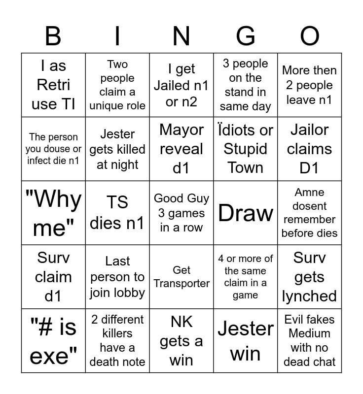 This bingo card has a free space and 24 words: Last person to join lobby, 2 different killers have a death note, Mayor reveal d1, "# is exe", More then 2 people leave n1, I as Retri use TI, The person you douse or infect die n1, Two people claim a unique role, Draw, Get Transporter, Ïdiots or Stupid Town, "Why me", 4 or more of the same claim in a game, Surv gets lynched, Jester gets killed at night, Jester win, Amne dosent remember before dies, I get Jailed n1 or n2, Jailor claims D1, TS dies n1, Evil fakes Medium with no dead chat, Surv claim d1, 3 people on the stand in same day and NK gets a win.