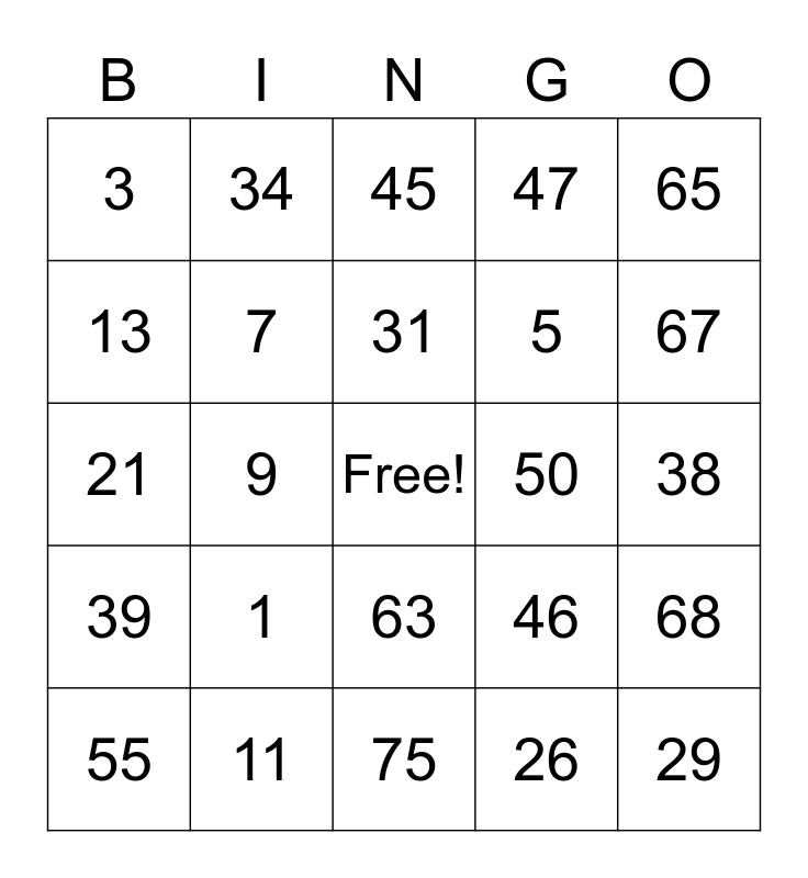This bingo card has a free space and 24 words: 1, 11, 31, 55, 65, 3, 13, 34, 50, 63, 5, 21, 46, 68, 7, 26, 38, 45, 67, 9, 29, 39, 47 and 75.