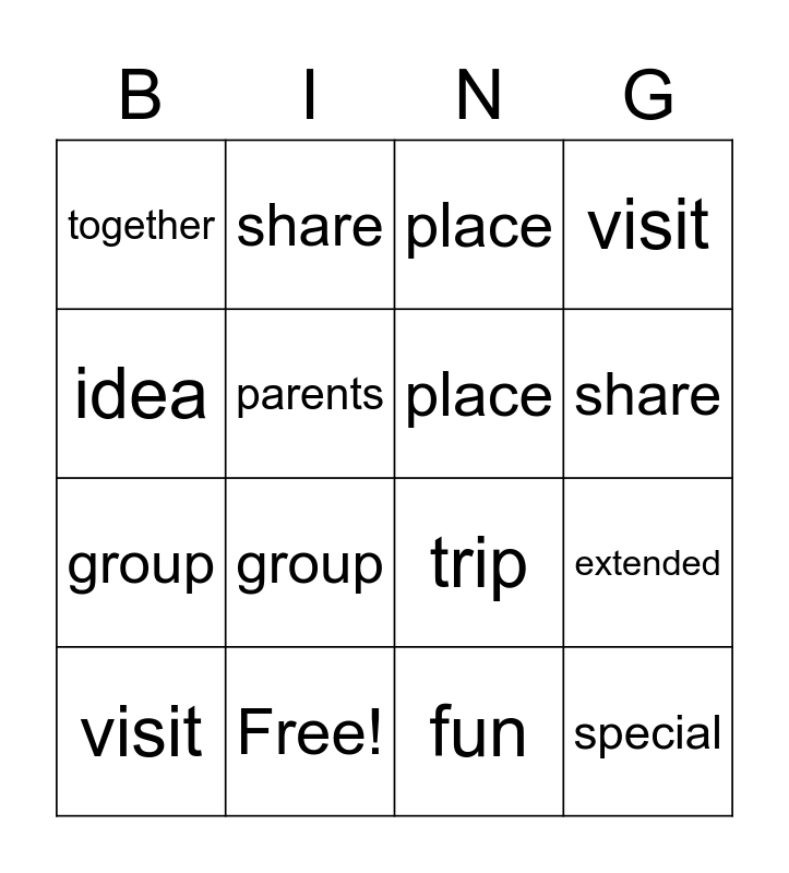 ⚠ This card has duplicate items: family (2), fun (3), group (3), idea (3), parents (3), place (2), share (2), special (2), together (2), trip (2), visit (2)