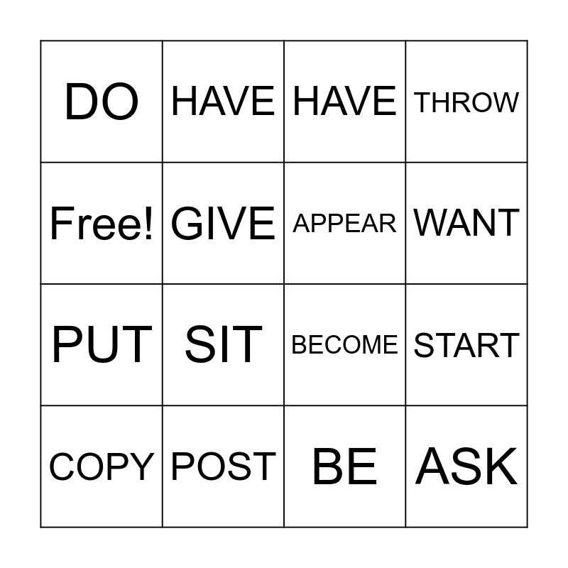 This bingo card has 16 words: POST, START, HAVE, DO, PUT, HAVE, BECOME, BE, Free!, GIVE, COPY, THROW, SIT, WANT, APPEAR and ASK.