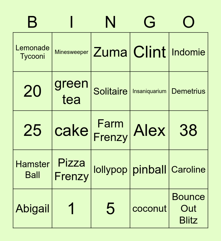 This bingo card has 25 words: Pizza Frenzy, 5, Solitaire, Abigail, Indomie, Lemonade Tycooni, 20, Minesweeper, Alex, lollypop, Insaniquarium, 25, pinball, Caroline, green tea, Bounce Out Blitz, 38, Zuma, Demetrius, cake, Farm Frenzy, 1, Hamster Ball, Clint and coconut.