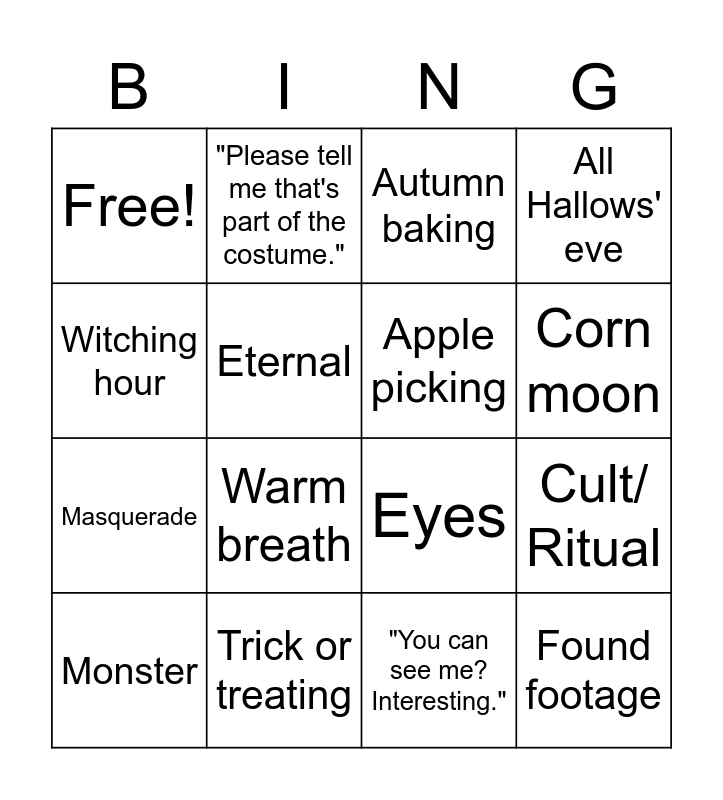 This bingo card has 16 words: Monster, Trick or treating, Autumn baking, All Hallows' eve, Witching hour, "Please tell me that's part of the costume.", Eyes, Cult/ Ritual, Free!, Eternal, "You can see me? Interesting.", Corn moon, Masquerade, Warm breath, Apple picking and Found footage.