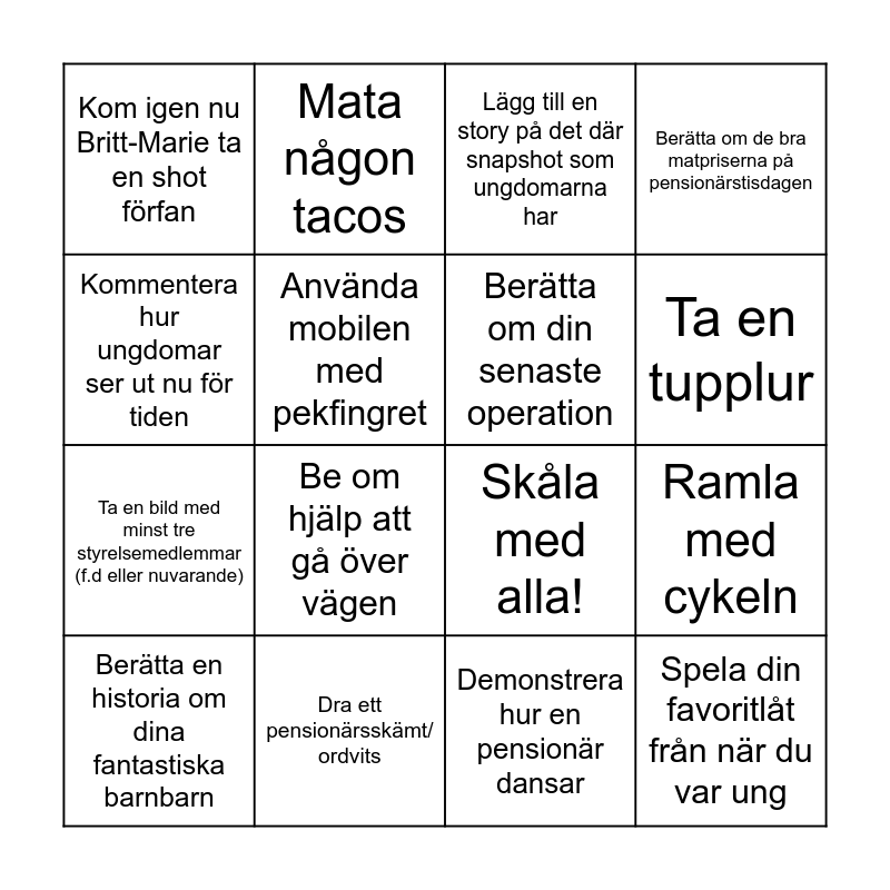 This bingo card has 16 words: Dra ett pensionärsskämt/ ordvits, Ramla med cykeln, Lägg till en story på det där snapshot som ungdomarna har, Kom igen nu Britt-Marie ta en shot förfan, Ta en bild med minst tre styrelsemedlemmar (f.d eller nuvarande), Mata någon tacos, Skåla med alla!, Demonstrera hur en pensionär dansar, Kommentera hur ungdomar ser ut nu för tiden, Använda mobilen med pekfingret, Berätta en historia om dina fantastiska barnbarn, Berätta om de bra matpriserna på pensionärstisdagen, Be om hjälp att gå över vägen, Ta en tupplur, Berätta om din senaste operation and Spela din favoritlåt från när du var ung.