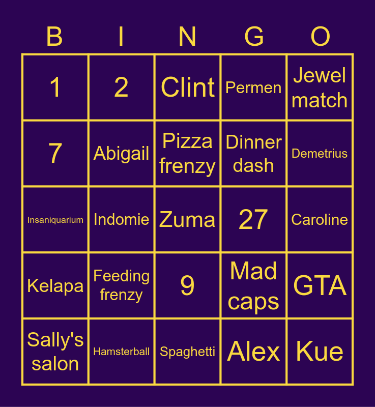 This bingo card has a free space and 24 words: Feeding frenzy, Hamsterball, Pizza frenzy, Sally's salon, Jewel match, 1, 7, 2, 27, 9, Dinner dash, Insaniquarium, Mad caps, GTA, Abigail, Alex, Caroline, Clint, Demetrius, Indomie, Kue, Kelapa, Permen and Spaghetti.