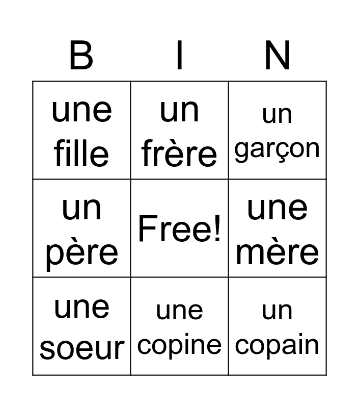 This bingo card has a free space and 8 words: un père, un frère, une mère, une soeur, un garçon, une fille, une copine and un copain.