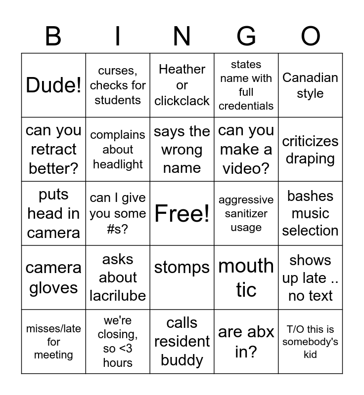 This bingo card has a free space and 26 words: stomps, are abx in?, says the wrong name, we're closing, so <3 hours, Canadian style, Dude!, can you retract better?, curses, checks for students, bashes music selection, mouth tic, can you make a video?, puts head in camera, shows up late .. no text, misses/late for meeting, can I give you some #s?, sorry I'm teaching so much, states name with full credentials, camera gloves, Heather or clickclack, T/O this is somebody's kid, criticizes draping, calls resident buddy, aggressive sanitizer usage, asks about lacrilube, complains about headlight and asks about total blood volume.