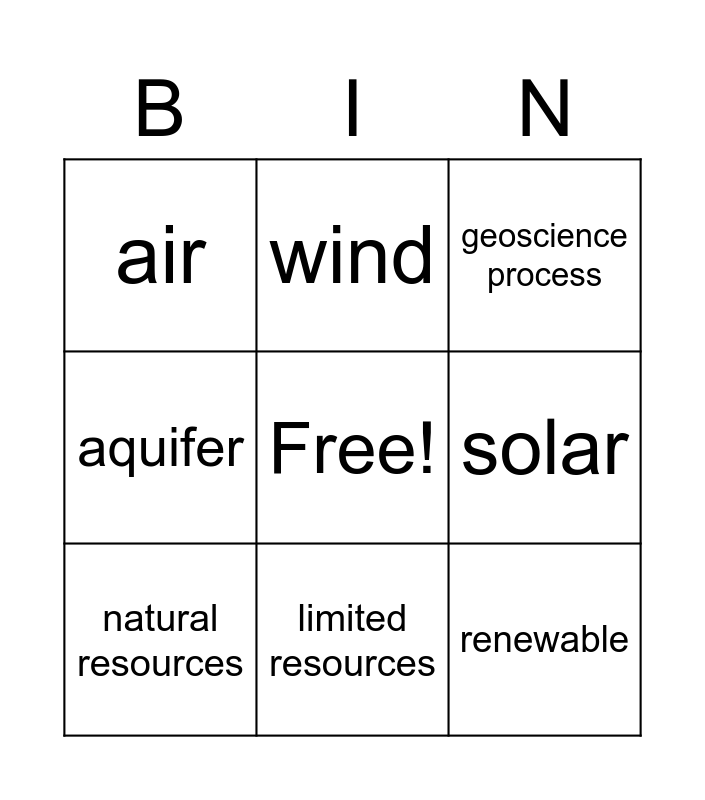 This bingo card has a free space and 11 words: nonrenewable, limited resources, renewable, natural resources, wind, geoscience process, solar, unevenly, aquifer, air and oil.