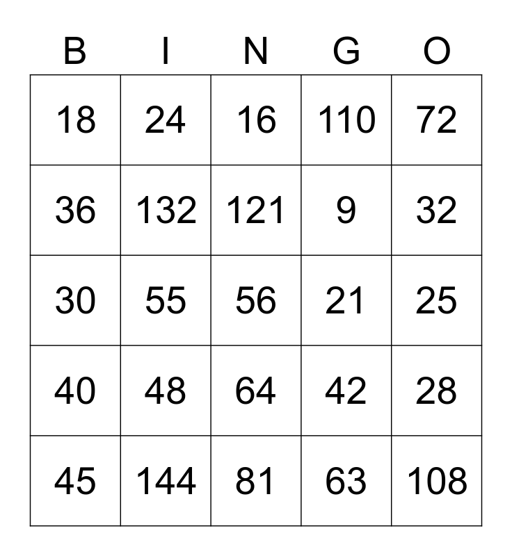 This bingo card has 25 words: 40, 144, 56, 63, 72, 18, 24, 16, 21, 28, 36, 132, 81, 42, 32, 45, 55, 121, 9, 25, 30, 48, 64, 110 and 108.
