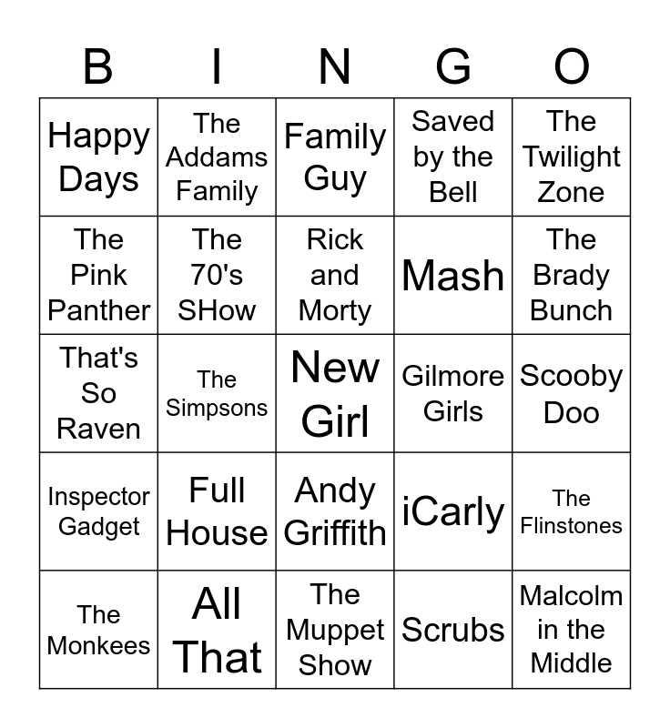 This bingo card has 64 words: Cheers, Friends, Fresh Prince of Belair, The Flinstones, Mission Impossible, Seinfield, The Addams Family, Drake and Josh, Rick and Morty, Sesame Street, Andy Griffith, I Love Lucy, Scooby Doo, The Twilight Zone, NFL Monday Night, The Pink Panther, The Simpsons, Happy Days, Law and Order, Mash, Full House, Inspector Gadget, Saved by the Bell, Looney Tunes, The Fairly Odd Parents, Jimmy Neutron, Gilligan's Island, The Jefferson's, Spongebob, Shaft, Batman, Game of Thrones, Jeopardy, Hawaii Five-O, The Brady Bunch, The Monkees, The Olympics, Scrubs, Cops, The 70's SHow, That's So Raven, Gilmore Girls, The Office, The Golden Girls, Sanford and Son, New Girl, All That, Malcolm in the Middle, iCarly, Sofia the First, Hannah Montanna, George of the Jungle, The Muppet Show, The Jetsons, Teenage Mutant Ninja Turtles, Ducktales, Family Guy, Reba, Big Bang Theory, King of the Hill, Johnny Bravo, Animaniacs, Who Wants to be a Millionaire and Indiana Jones.
