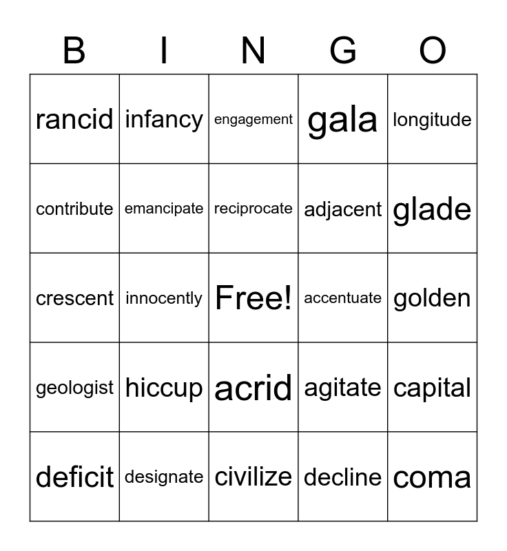 This bingo card has a free space and 33 words: congested, disgraceful, innocently, fugitive, geologist, emancipate, longitude, deficit, infancy, centipede, reciprocate, engagement, vacancy, legislate, accentuate, glade, designate, crescent, hiccup, agitate, acrid, coincide, rancid, golden, civilize, coma, gala, adjacent, contribute, capital, guzzle, decline and legend.
