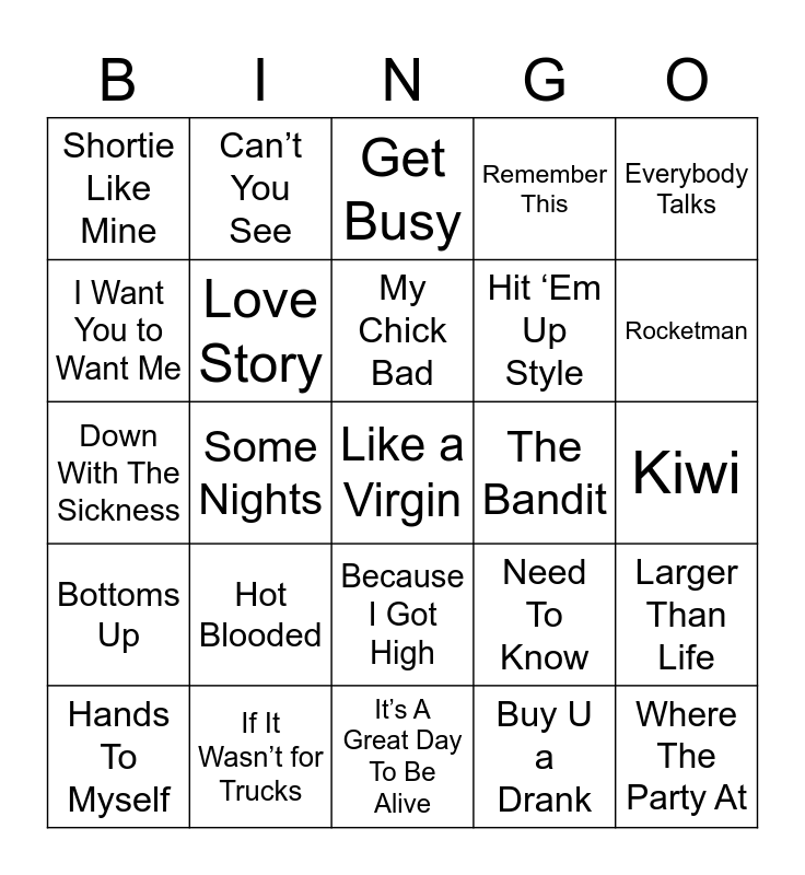 This bingo card has 49 words: Margaritaville, Like a Virgin, We Will Rock You, It’s A Great Day To Be Alive, Hot Blooded, Copperhead Road, Can’t You See, I Was Made for Lovin’ You, I Want You to Want Me, Walking on A Dream, Love Story, Remember This, Larger Than Life, Need To Know, Bulletproof, Lose Yourself, My Chick Bad, The Bandit, Hey Look Ma, I Made It, Everybody Talks, Some Nights, Buy U a Drank, Shortie Like Mine, Hit ‘Em Up Style, Sweater Weather, Rocketman, Hands To Myself, Temperature, Because I Got High, Bottoms Up, Astronaut In the Ocean, Bust A Move, Mr. Brightside, Dance Her Home, If It Wasn’t for Trucks, Whitehouse Road, God Speed, Hard to Love, Kiwi, I Hope Your Happy Now, Lonely if you Are, Cry Me a River, Where The Party At, Yo (Excuse Me Miss), Down With The Sickness, Get Busy, Just Dance, Hot N Cold and Right Round.