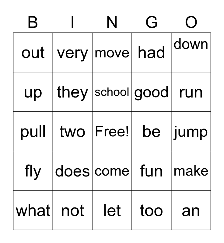 This bingo card has a free space and 24 words: does, not, school, what, down, out, up, very, be, come, good, pull, fun, make, they, too, jump, move, run, two, an, fly, had and let.