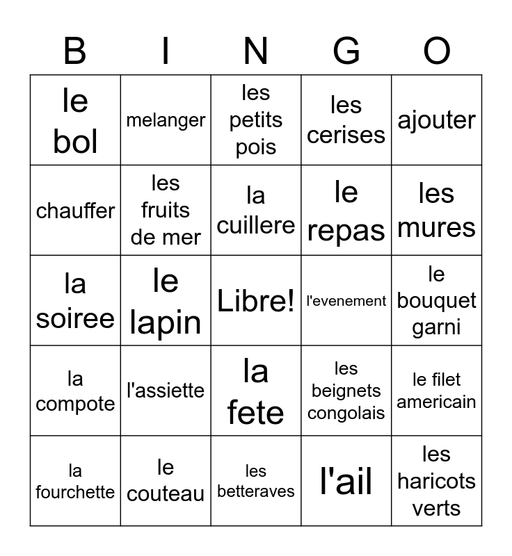 This bingo card has a free space and 24 words: l'assiette, le couteau, la cuillere, la fourchette, ajouter, le bol, chauffer, melanger, l'evenement, la fete, le repas, la soiree, les beignets congolais, le filet americain, les fruits de mer, l'ail, le bouquet garni, les petits pois, les mures, le lapin, les haricots verts, la compote, les cerises and les betteraves.