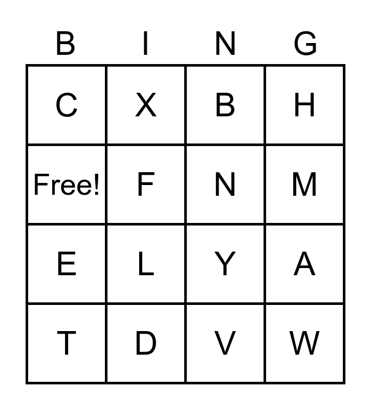 This bingo card has 16 words: D, A, B, C, E, X, Y, V, Free!, F, T, H, L, M, N and W.