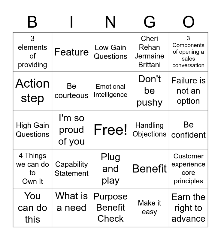 This bingo card has a free space and 24 words: Capability Statement, What is a need, Emotional Intelligence, You can do this, 3 Components of opening a sales conversation, 3 elements of providing, Action step, Feature, Handling Objections, Plug and play, Don't be pushy, High Gain Questions, Benefit, Customer experience core principles, Be courteous, Make it easy, Be confident, Low Gain Questions, Failure is not an option, I'm so proud of you, Earn the right to advance, 4 Things we can do to Own It, Cheri Rehan Jermaine Brittani and Purpose Benefit Check.