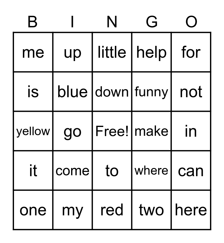 This bingo card has a free space and 38 words: and, away, big, blue, can, come, down, find, for, funny, go, help, here, in, is, it, jump, little, look, make, me, my, not, one, play, red, run, said, see, the, three, to, two, up, we, where, yellow and you.