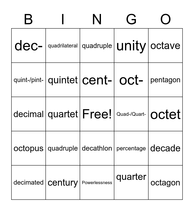 This bingo card has a free space and 24 words: quadruple, century, cent-, decimated, octave, dec-, quint-/pint-, quadrilateral, Quad-/Quart-, decathlon, oct-, decimal, percentage, decade, quintet, quarter, octet, quadruple, pentagon, quartet, octagon, octopus, unity and Powerlessness.