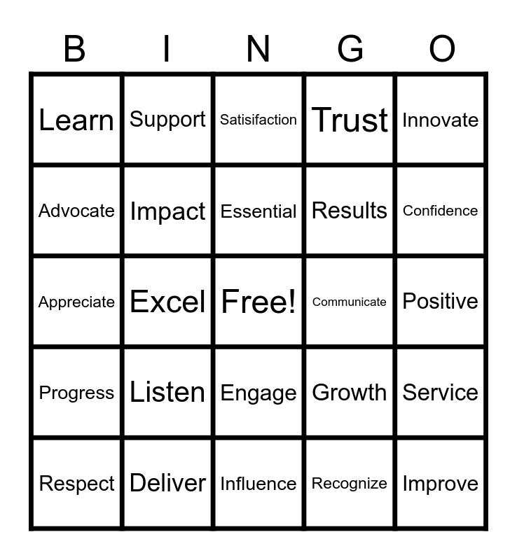 This bingo card has a free space and 24 words: Listen, Deliver, Essential, Respect, Innovate, Learn, Advocate, Support, Communicate, Engage, Results, Appreciate, Growth, Service, Impact, Recognize, Positive, Satisifaction, Confidence, Excel, Improve, Progress, Trust and Influence.