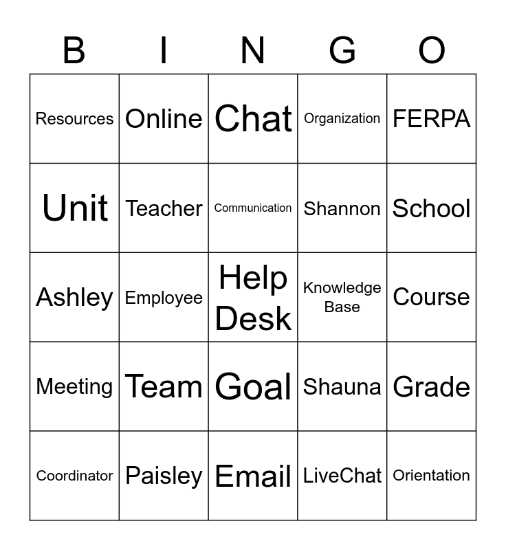 This bingo card has a free space and 37 words: Release, Exam, Test, Teacher, Grade, Team, Communication, Policy, FERPA, Privacy, Employee, Organization, Orientation, Course, Unit, Meeting, Phone, Chat, Goal, Knowledge Base, Resources, School, Coordinator, Email, Help, LiveChat, Online, East Shore, Julie, Amber, Trinity, Paisley, Ashley, McKenna, Shauna, Shannon and Jenn.