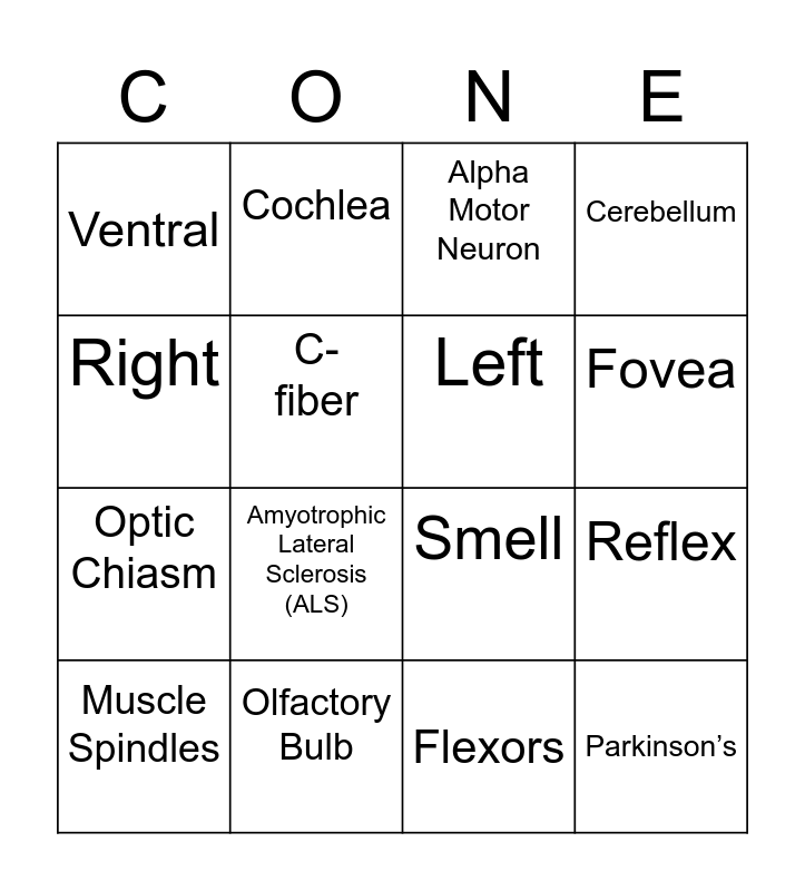 This bingo card has 25 words: Ganglion Cells, Rods, Fovea, Lateral Geniculate Nucleus, Right, Ventral, C-fiber, Cochlea, Olfactory Bulb, Somatosensory System, Optic Chiasm, Smell, Nociceptors, Endorphins, Left, Central Nervous System, Flexors, Alpha Motor Neuron, Amyotrophic Lateral Sclerosis (ALS), Reflex, Muscle Spindles, Motor Cortex, Parkinson’s, Cerebellum and Huntington’s.