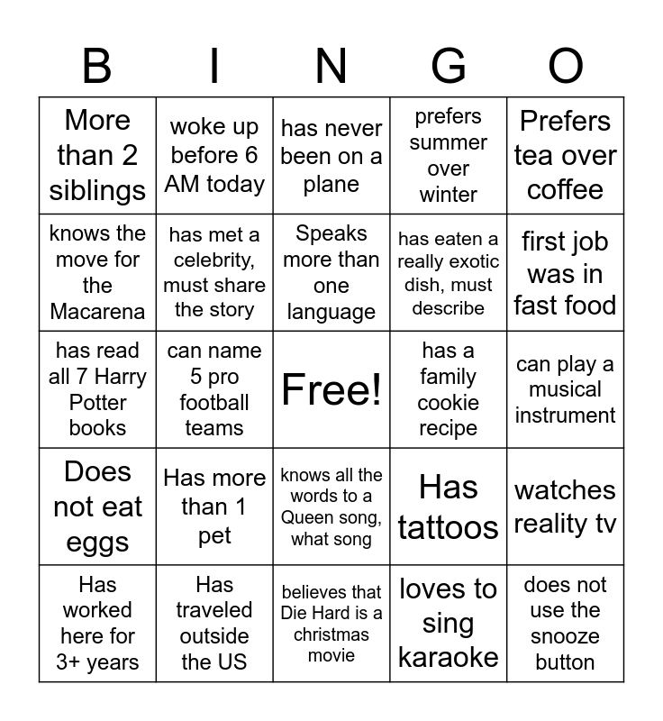 This bingo card has a free space and 24 words: Has more than 1 pet, Has traveled outside the US, Speaks more than one language, Has worked here for 3+ years, Prefers tea over coffee, More than 2 siblings, knows the move for the Macarena, woke up before 6 AM today, has a family cookie recipe, knows all the words to a Queen song, what song, has eaten a really exotic dish, must describe, has read all 7 Harry Potter books, Has tattoos, watches reality tv, has met a celebrity, must share the story, loves to sing karaoke, can play a musical instrument, has never been on a plane, first job was in fast food, can name 5 pro football teams, does not use the snooze button, Does not eat eggs, prefers summer over winter and believes that Die Hard is a christmas movie.