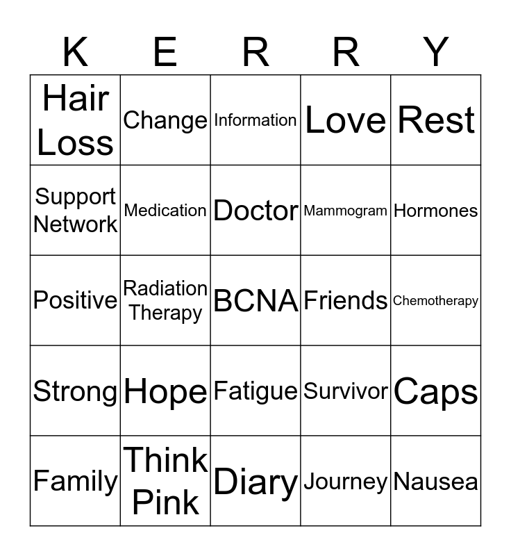 This bingo card has a free space and 24 words: Hope, Think Pink, Doctor, Family, Rest, Hair Loss, Support Network, Change, Friends, Fatigue, Mammogram, Positive, Survivor, Caps, Medication, Journey, Chemotherapy, Information, Hormones, Radiation Therapy, Nausea, Strong, Love and Diary.