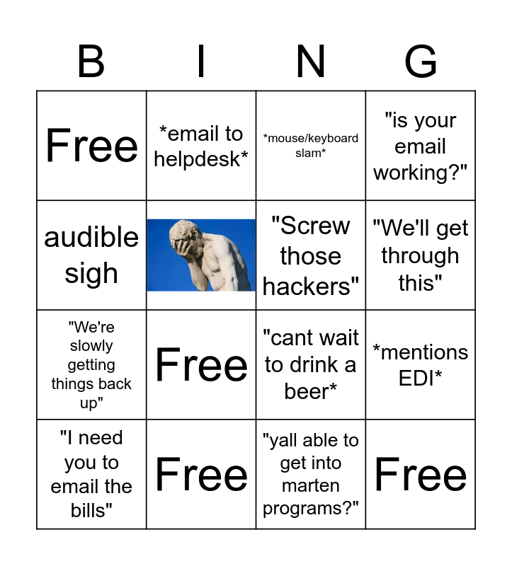 This bingo card has 1 images and 15 words: Free, *mentions EDI*, *mouse/keyboard slam*, Free, "We're slowly getting things back up", *email to helpdesk*, "cant wait to drink a beer*, "yall able to get into marten programs?", audible sigh, "I need you to email the bills", "is your email working?", Free, "We'll get through this", "Screw those hackers" and Free.