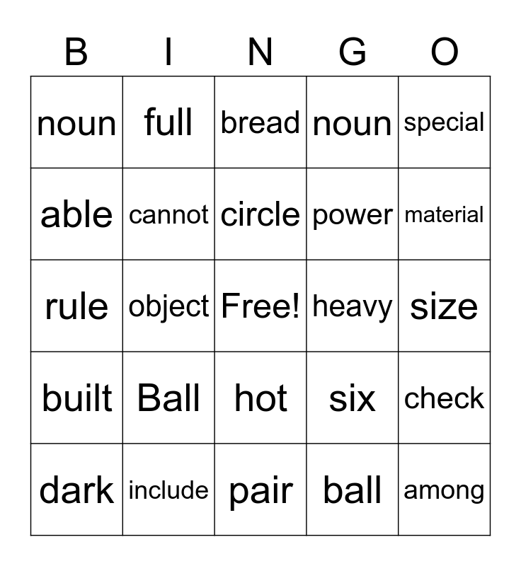 This bingo card has a free space and 25 words: Ball, pair, circle, dark, special, noun, able, full, heavy, hot, power, rule, six, check, cannot, filled, size, bread, material, object, among, include, built, noun and ball.